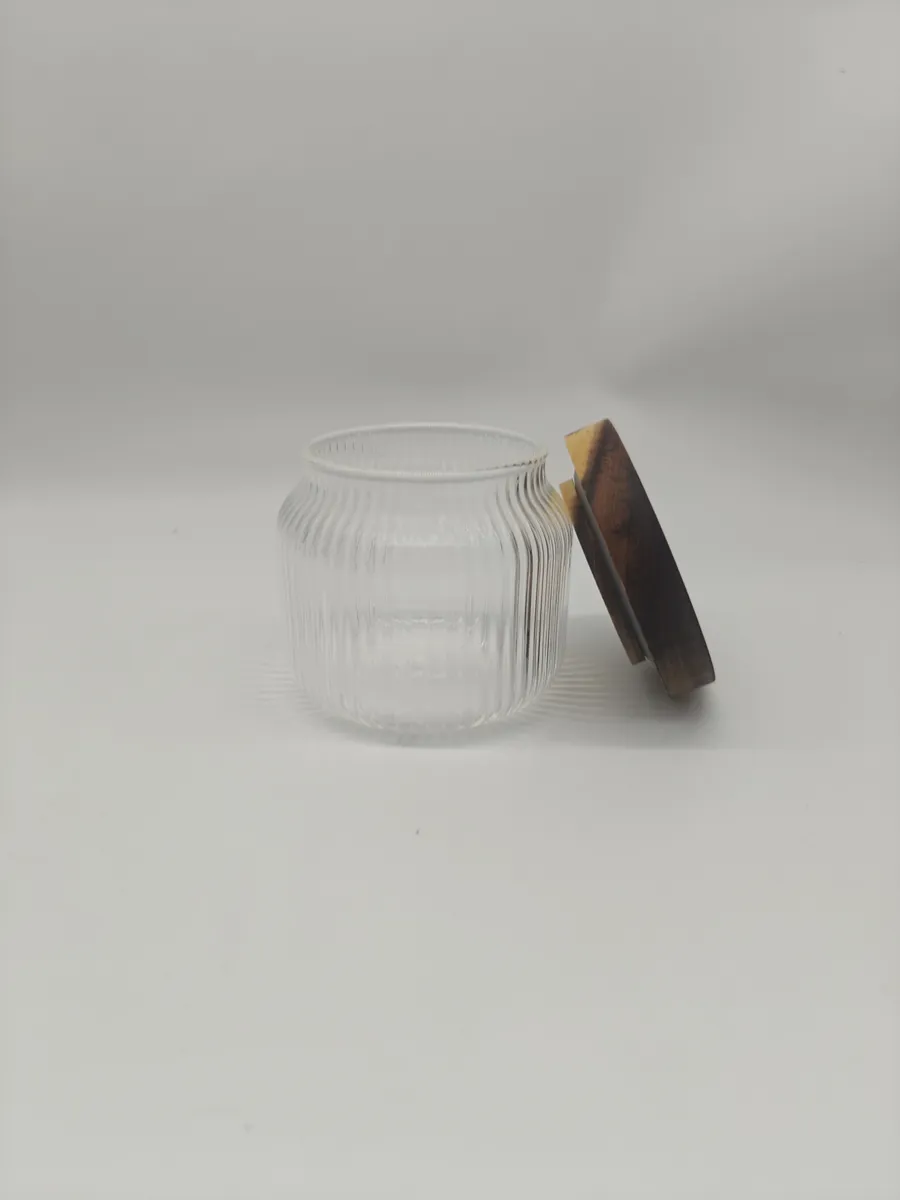 Буркан с дървен капак 350 мл — с топъл естествен вид, подходящ за кухненска декорация и съхранение на подправки.