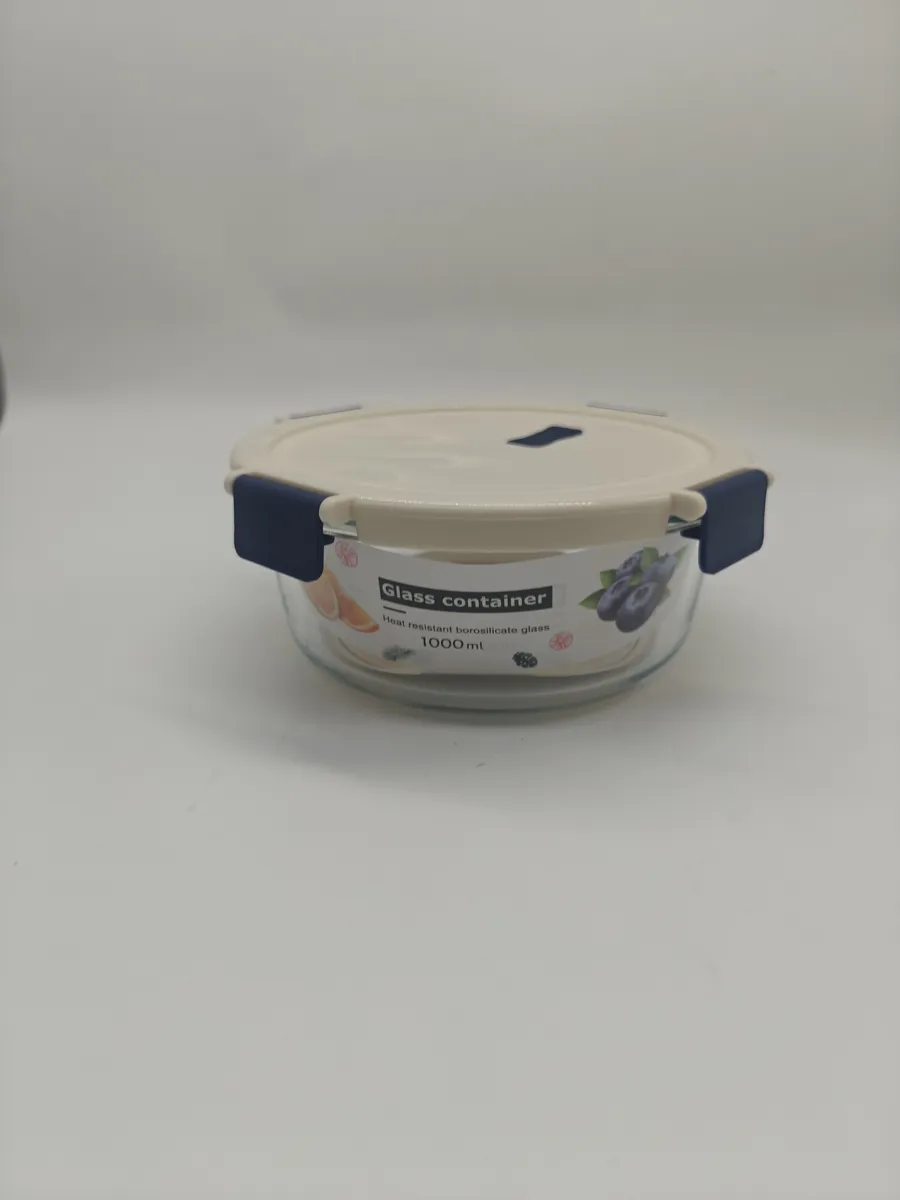 Стъклена купа с кръгъл капак 1000 мл — голяма стъклена кутия за съхранение на храна. Сигурно затваряне и чисто стъкло.